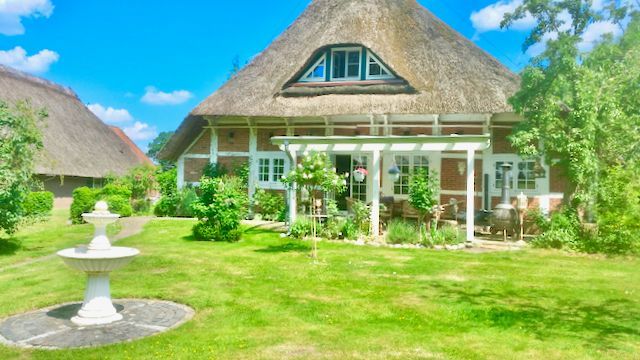 Repräsentativer Landsitz - stilvoll saniertes, Reetdachanwesen mit prachtvollem Garten, Scheune, arrondierter Weide & Fernblick